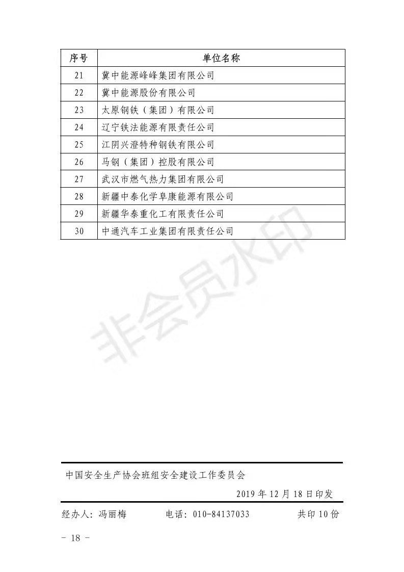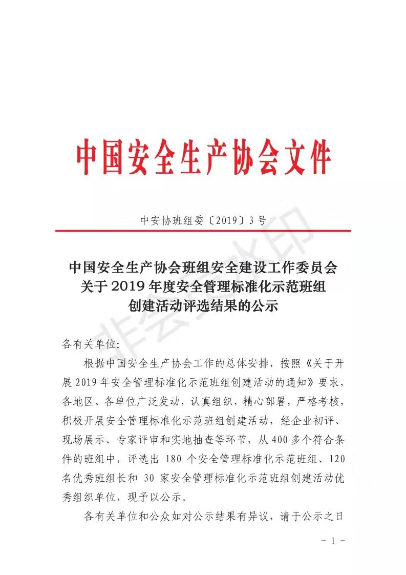 根据中国安全生产协会工作的总体安排,按照《关于开展2019年安全管理标准化示范班组创建活动的通知》要求,各地区、各单位广泛发动,认真组织,精心部署,严格考核,积极开展安全管理标准化示范班组创建活动,经企业初评、现场展示、专家评审和实地抽查等环节,从400多个符合条件的班组中,评选出180个安全管理标准化示范班组、120名优秀班组长和30家安全管理标准化示范班组创建活动优秀组织单位,现予以公示。