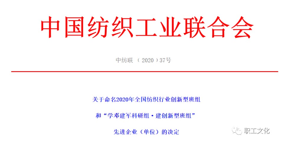 2020年9月14日,中国纺织工业联合会命名10家企业为“学邓建军科研组·建创新型班组”先进企业(单位)称号。