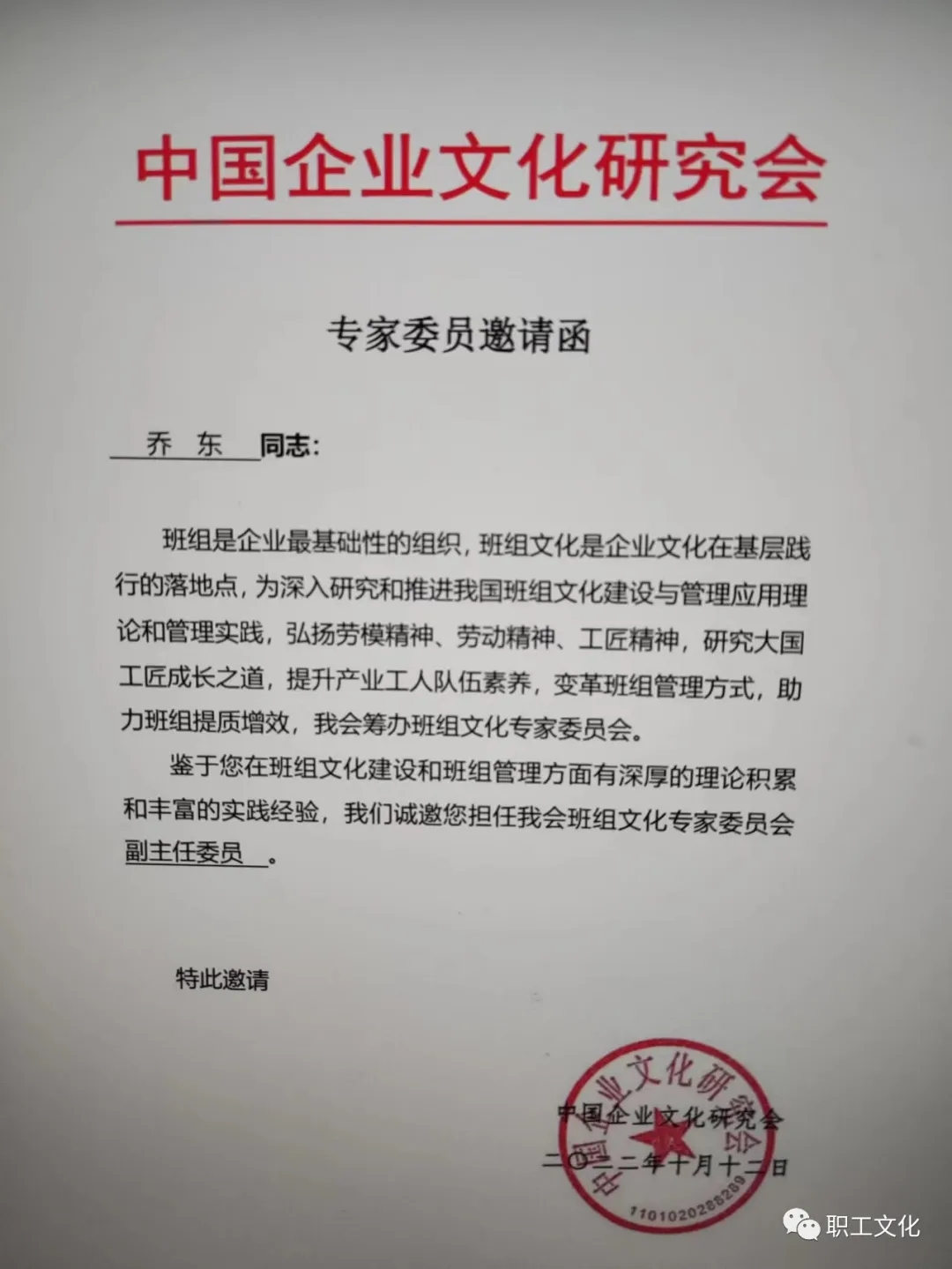 2022年10月12日,中国企业文化研究会邀请中国劳动关系学院乔东担任全国班组文化专家委员会副主任委员。