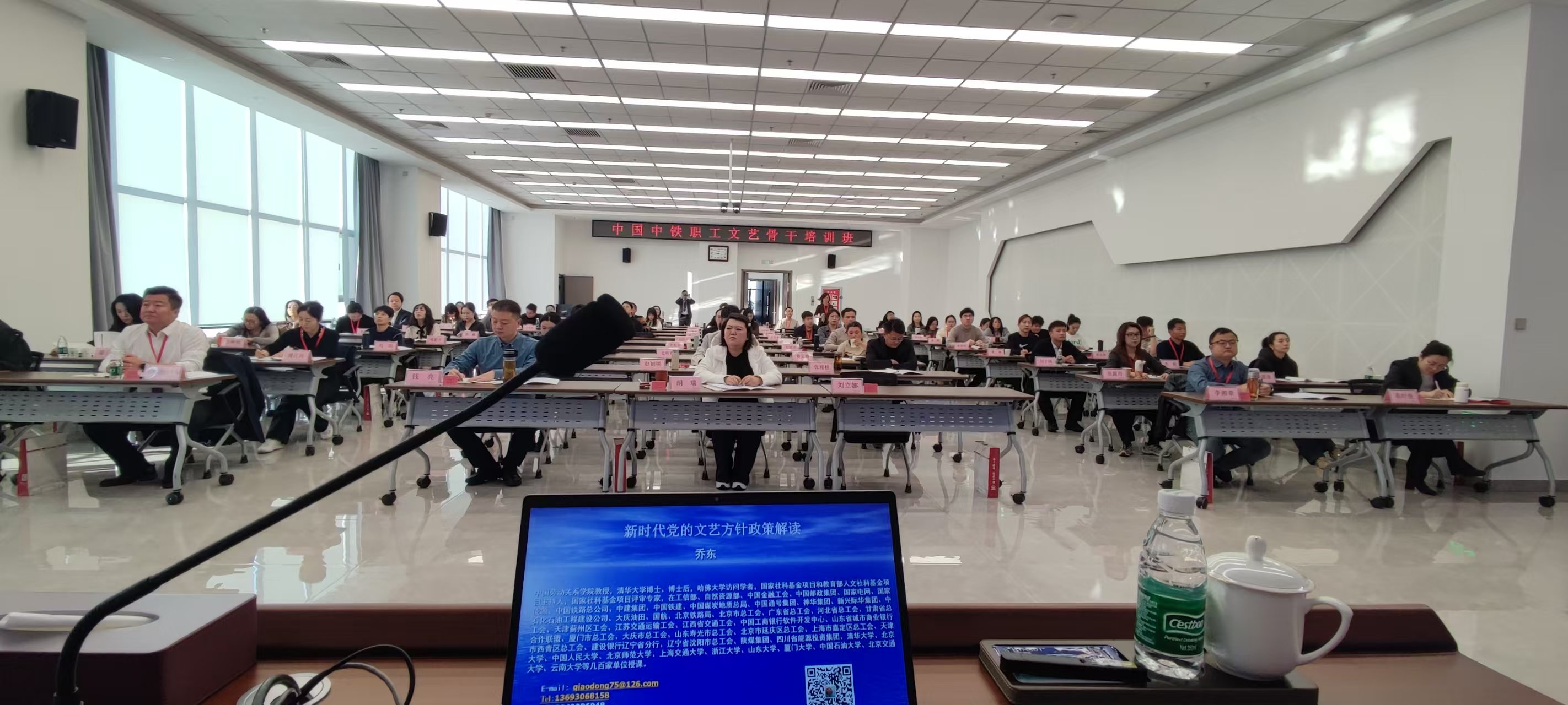 近日,乔东在中国中铁党校为中国中铁职工文艺骨干培训班宣讲新时代党的文艺方针政策课程。乔东指出,新时代职工文艺工作要以党的二十届四中全会精神特别是习近平总书记在文艺工作座谈会上的重要讲话精神为指导,以《中共中央关于繁荣发展社会主义文艺的意见》为遵循,按照《中华全国总工会关于加强新时代职工文化建设的指导意见》的要求,以培育和践行社会主义核心价值观为主线,以“中国梦•劳动美”为主题,以满足职工群众精神文化需求为中心,着力构建职工文化繁荣发展的工作体系,为实现中华民族伟大复兴的中国梦提供强大价值引导力、文化凝聚力和精神推动力等。中国中铁为贯彻落实《中共中央关于繁荣发展社会主义文艺的意见》特别是习近平总书记关于文艺工作的重要论述,大力繁荣职工文化,弘扬社会主义核心价值观和劳模精神、劳动精神、工匠精神,大力弘扬开路先锋精神,增强职工群众文化自信,组织开展了“凝心铸魂跟党走、团结奋斗新征程”——摄影、书画、文学、文艺、视频等职工文化“五个一”作品征集活动、各级工会组织广泛宣传、积极动员,广大职工群众踊跃参与,涌现出来一大批优秀职工文化作品,充分展示了中国中铁在社会主义现代化强国建设征程中取得的巨大成就,充分彰显了中国中铁“勇于跨越、追求卓越”的企业精神,充分展现了新时代中国中铁职工踔厉奋发的新风貌。
